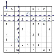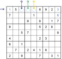 The sudoku puzzle on the left shows three empty cells in the first row, signed with blue, green and yellow question marks. To find out missing numbers we have to fix which one are still missed in the first line - these are ‘4’, ‘7’ and ‘8’. After that let’s have a look at the left (blue) field in the left-top 3x3 cluster. In this cell the residual numbers ‘4’ and ‘8’ could be placed, but if you look on the both adjacent 3x3 clusters, there is already an ‘8’ in each. According to our rules, the result is that the 8 has to be filled in our blue cell.
